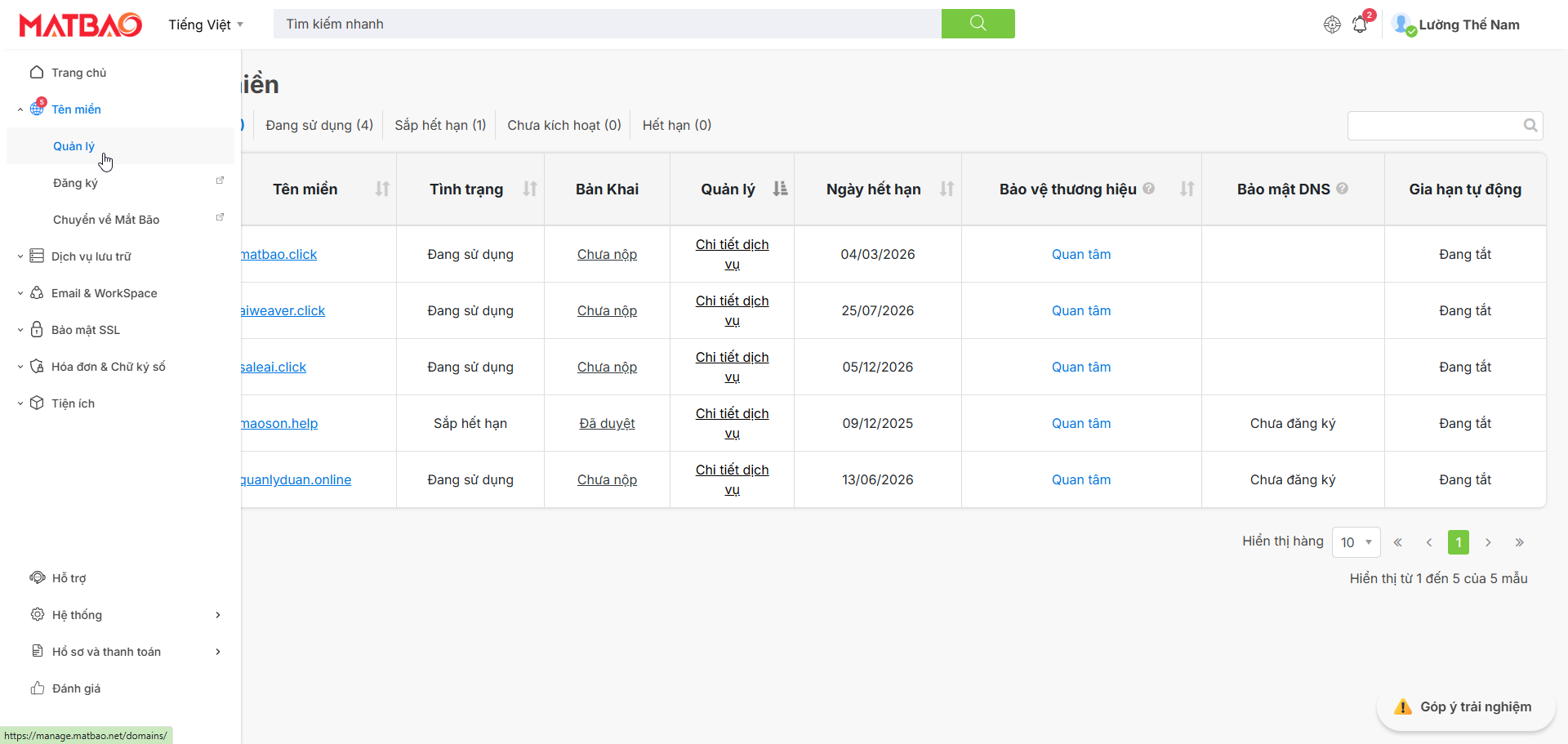 Tại giao diện chính của trang ID Mắt Bão, bạn chọn vào mục Tên miền sau đó chọn Quản lý và click vào tên miền mà bạn đã lựa chọn
