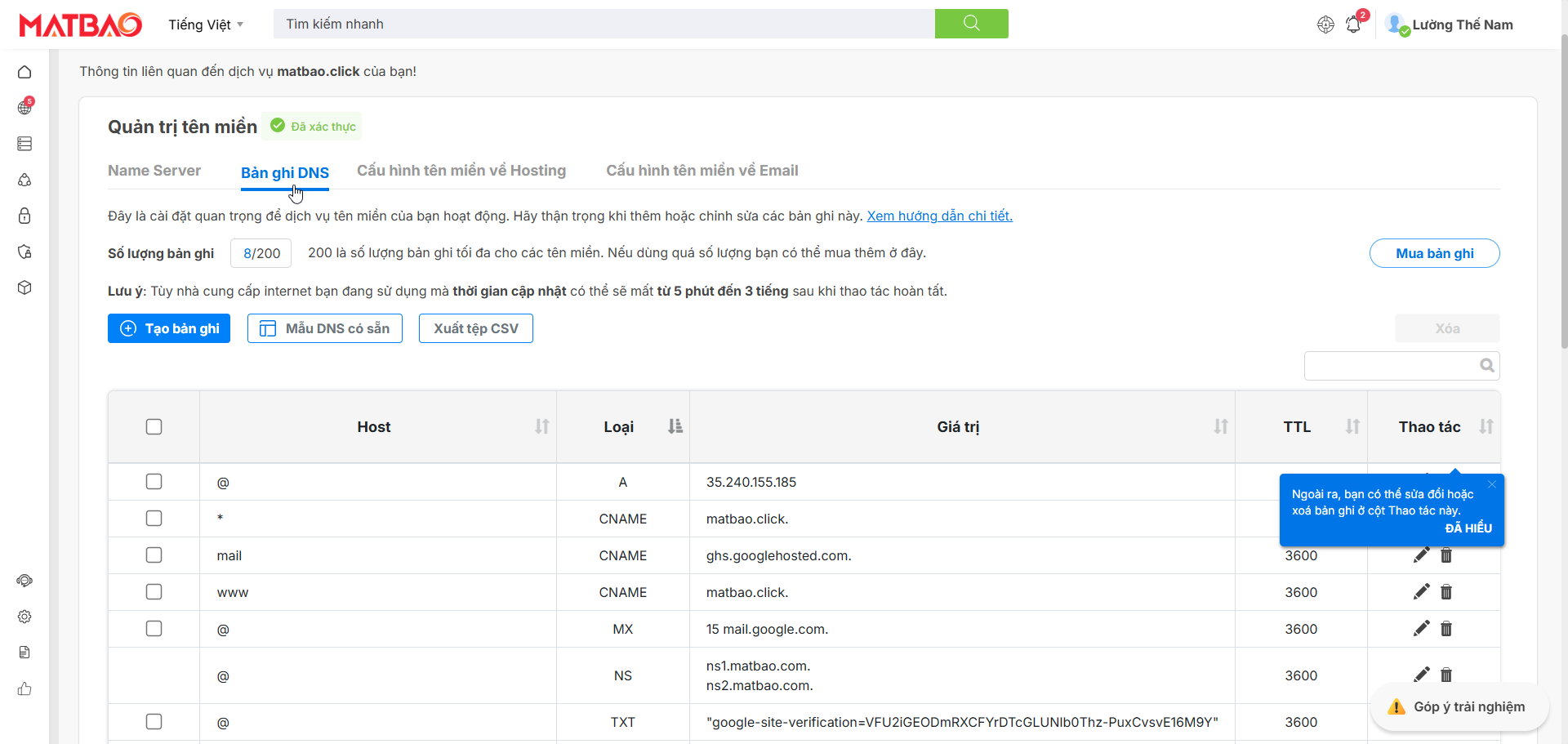 Bài viết này sẽ hướng dẫn bạn thực hiện việc cấu hình bản ghi DNS trực tiếp trên trang quản lý tên miền ID Mắt Bão, giúp bạn nhanh chóng liên kết tên miền riêng với Website đã tạo.
