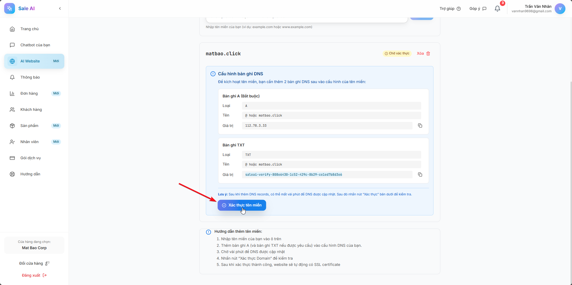 Sau khi đã hoàn tất việc cấu hình hai bản ghi DNS trên hệ thống quản lý tên miền, bạn quay lại trang Website Landing Page của mình để bắt đầu quá trình Xác thực tên miền