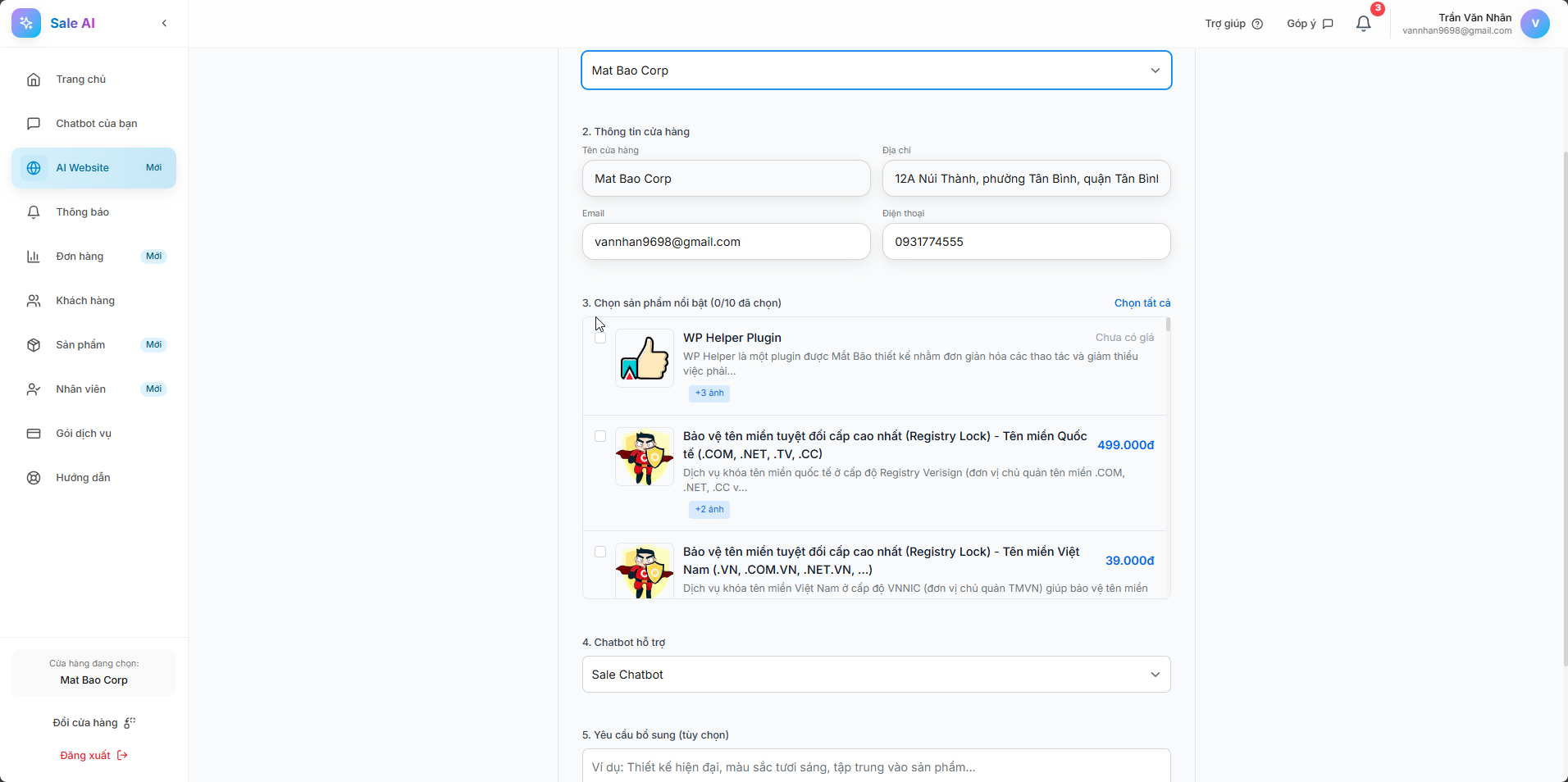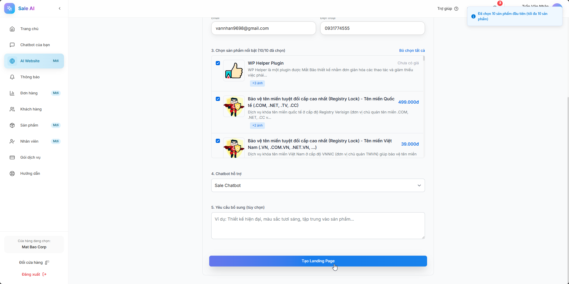 Bạn vui lòng chọn các Sản phẩm nổi bật và điền vào các Yêu cầu bổ sung (nếu cần). Sau đó, chọn Tạo Landing Page.