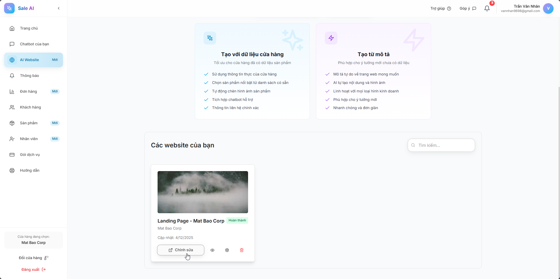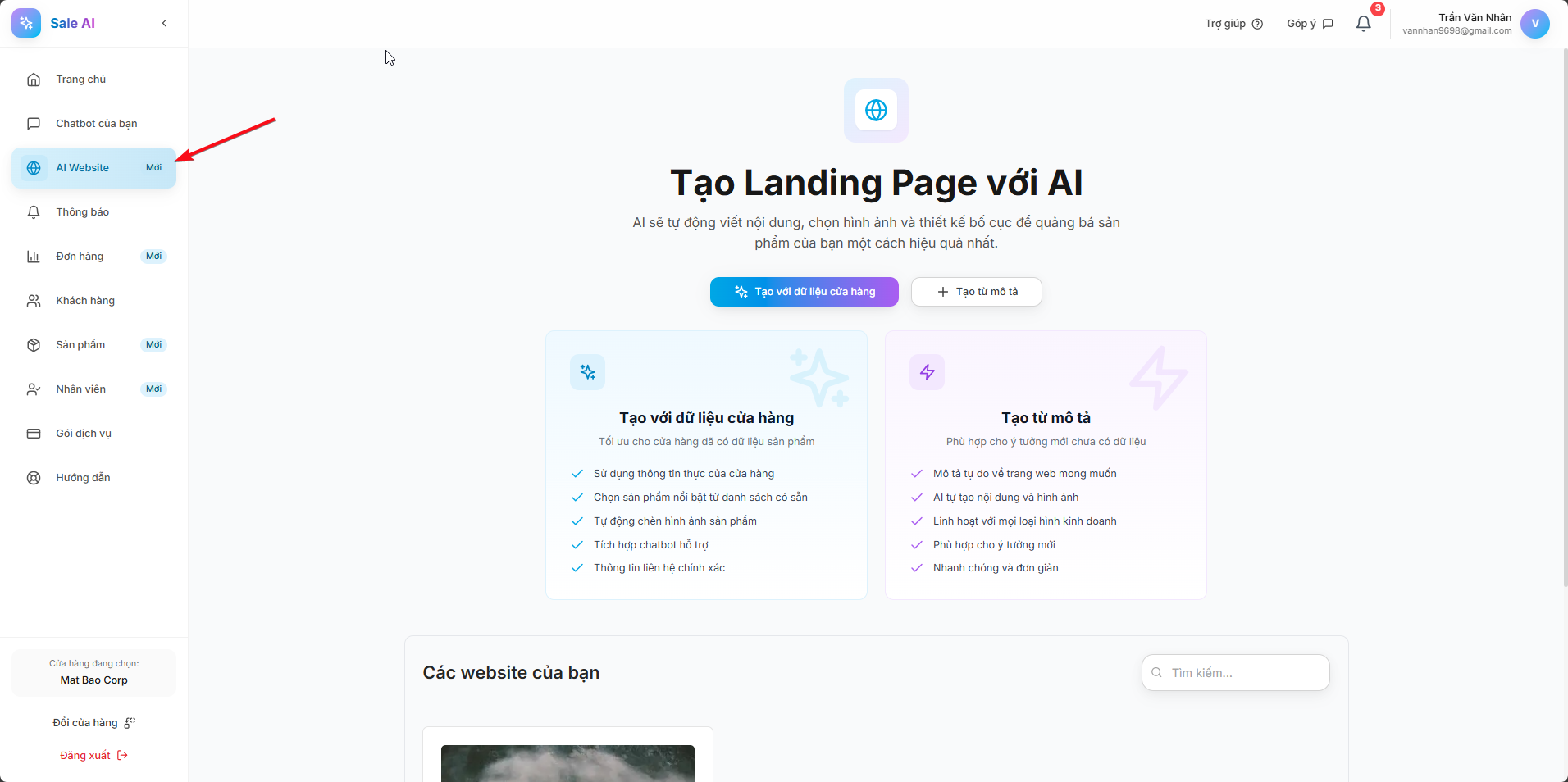 Từ giao diện chính, vào mục AI Website.
