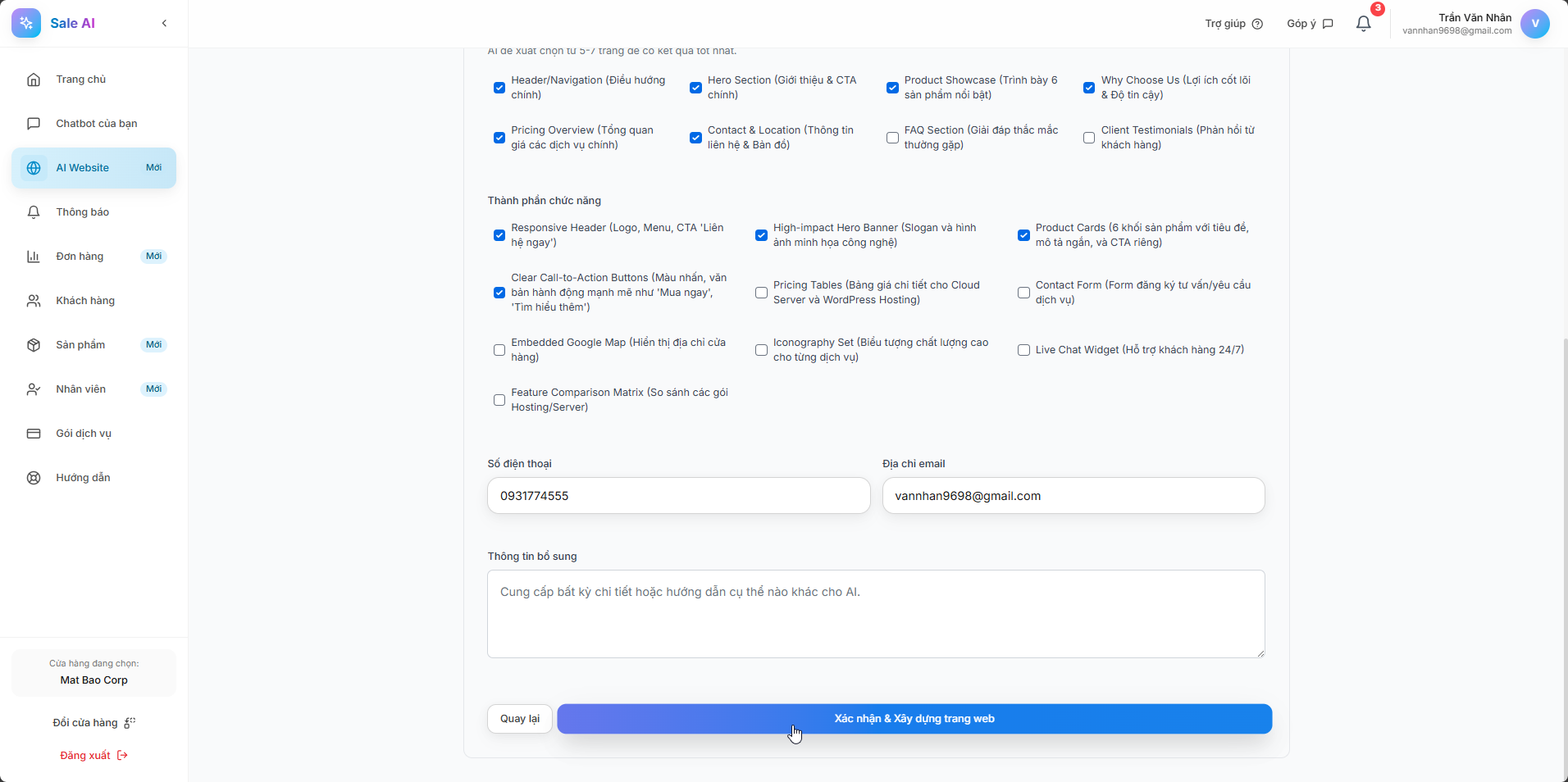 Sau khi đã kiểm tra hoàn tất, bạn chỉ cần nhấn ‘Xác nhận và Xây dụng trang Web’. Hệ thống sẽ ngay lập tức bắt đầu quá trình tạo dựng Website cho bạn.