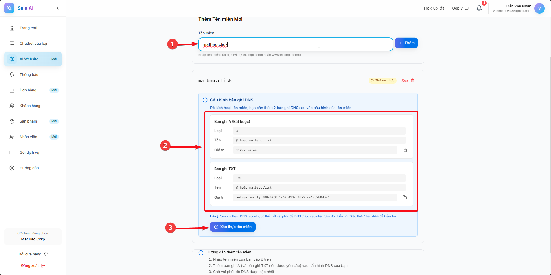 Tiếp theo, bạn vui lòng nhập tên miền bạn đã sở hữu và nhấn ‘+ Thêm’. Hệ thống sẽ cung cấp cho bạn các bản ghi DNS cần thiết. Bạn chỉ cần thực hiện thao tác cấu hình các bản ghi DNS này vào hệ thống quản lý DNS của mình.