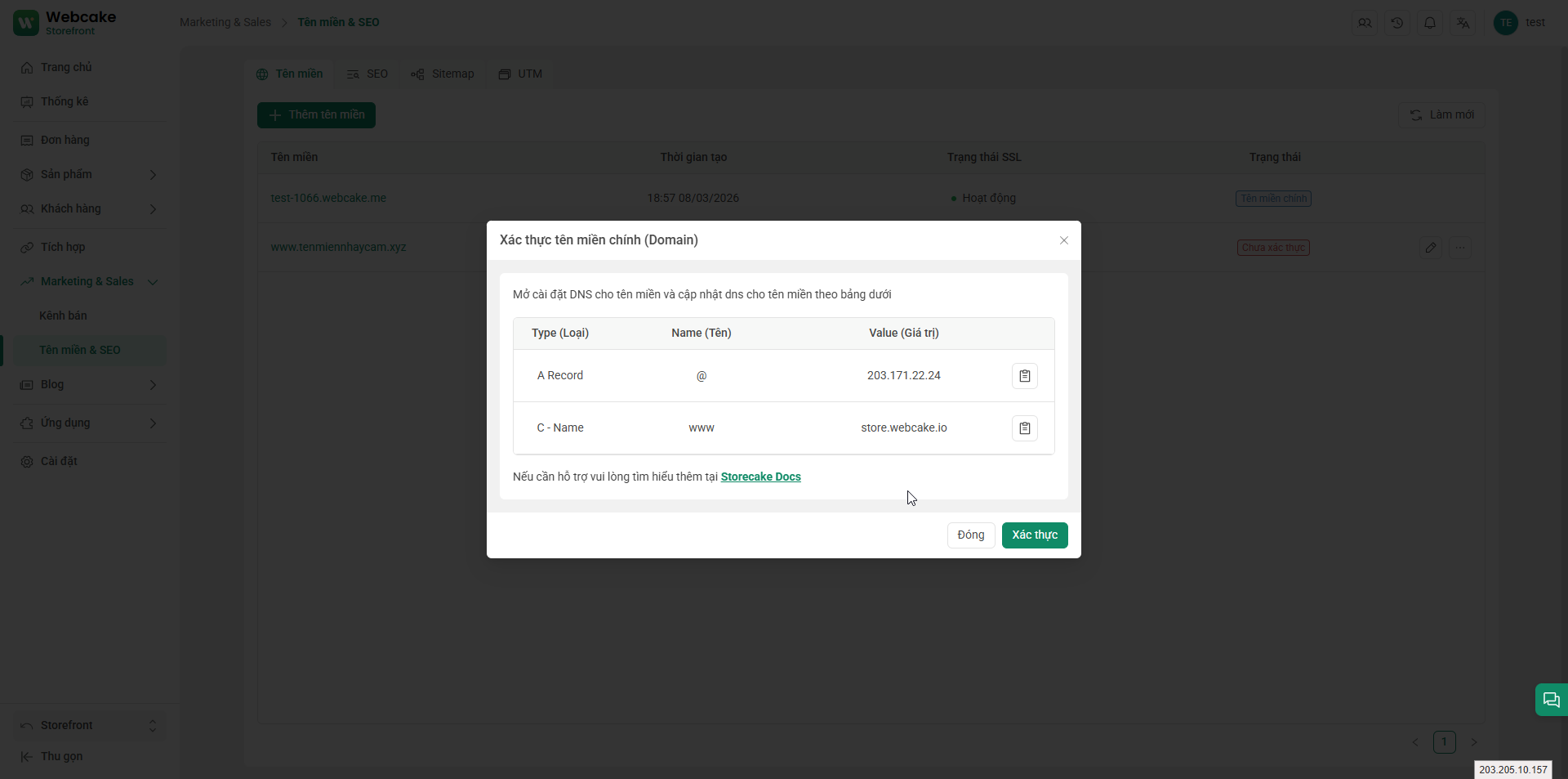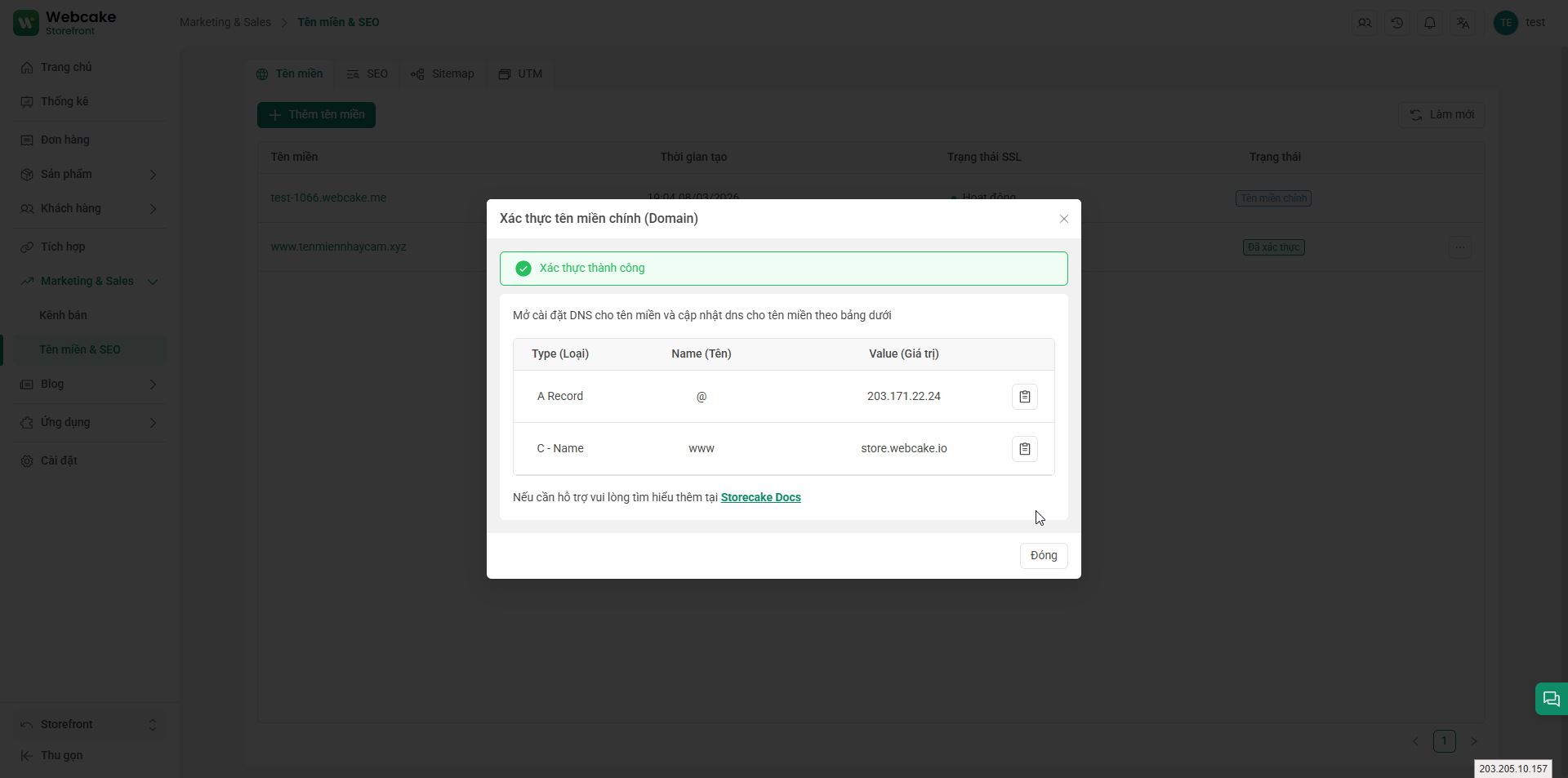 sau khi thêm xong bạn vui lòng đợi tối đa từ 30 – 45 phút để tên miền phân giải bản ghi về địa chỉ mới vừa cấu hình > quay lại trang webcake và chọn xác thực > thông báo Xác thực thành công