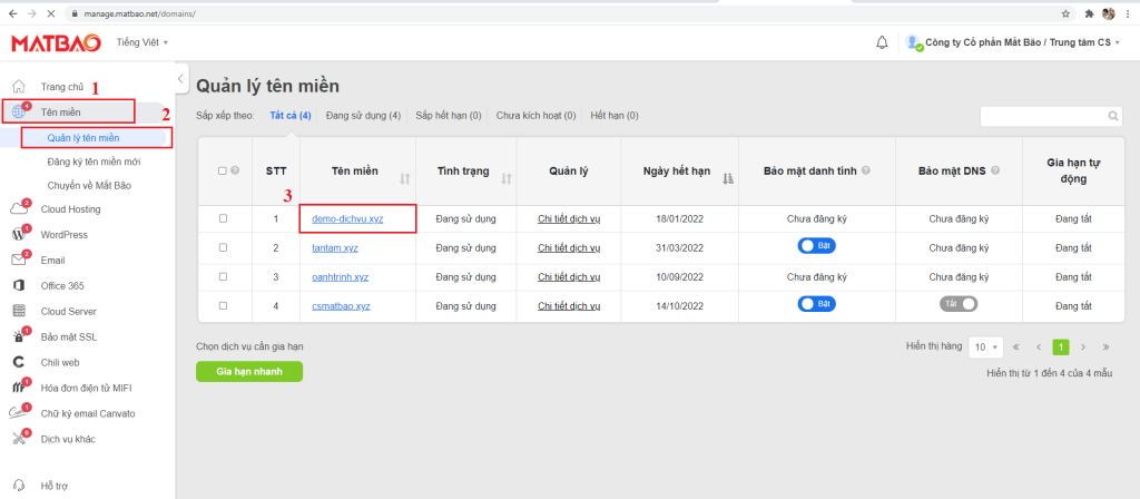 Bước 2: Bạn click vào mục “Tên miền” và click trực tiếp vào tên miền cần thực hiện.