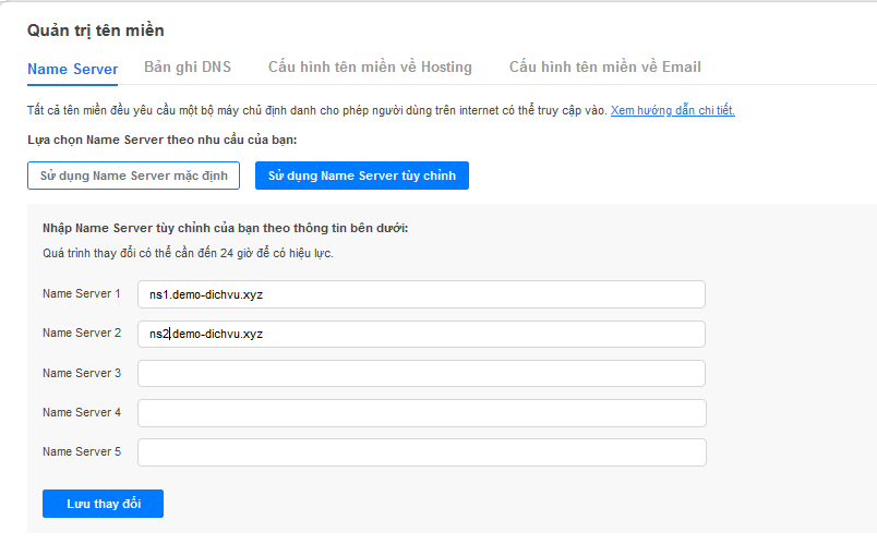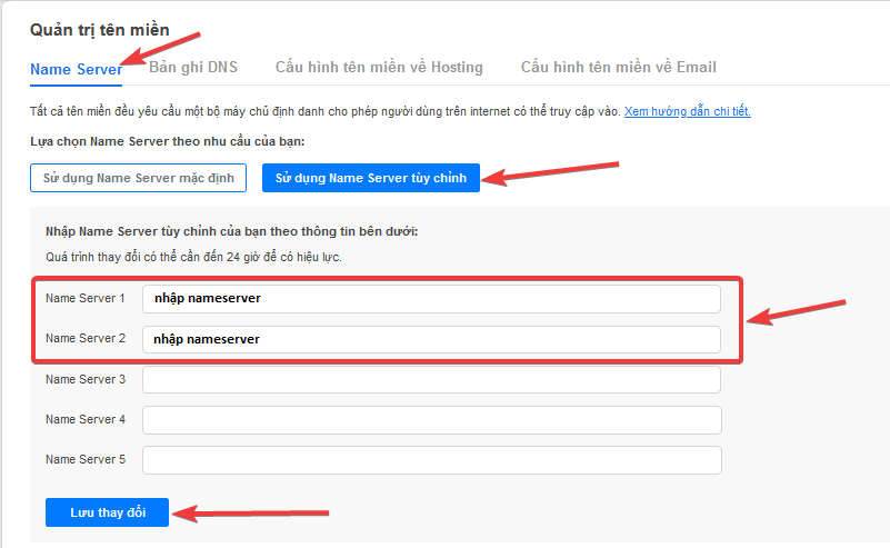 Bước 3: Bạn chọn Name Server >> chọn “Sử dụng Name Server Tùy chỉnh” và điền đây đủ thông tin cặp Nameserver (tên của Nameserver, IP của Nameserver). Và click vào “Lưu thay đổi” để hoàn tất