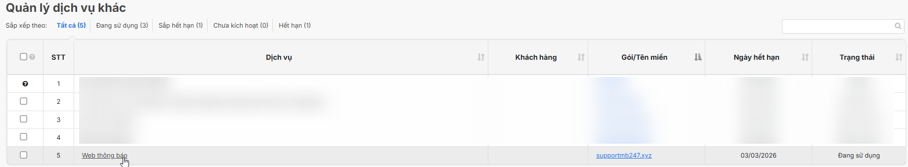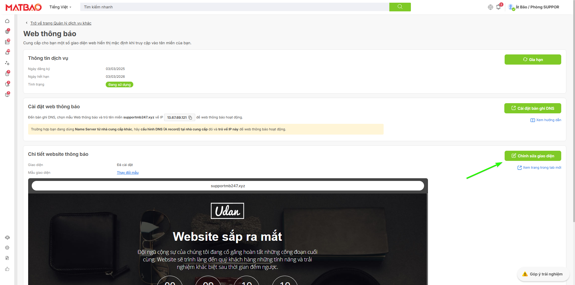 Tiếp theo, bạn vào mục Dịch vụ khác > chọn Quản lý Dịch vụ khác > click vào dịch vụ Website thông báo mà bạn cần chỉnh sửa > chọn Sửa giao diện