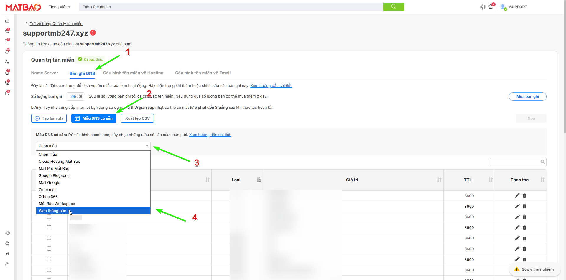 – Sau khi bấm nút cài đặt bản ghi DNS bạn sẽ được dẫn đến trang cấu hình bản ghi DNS tên miền và bạn có thể thao tác như sau để trỏ tên miền web máy chủ web thông báo