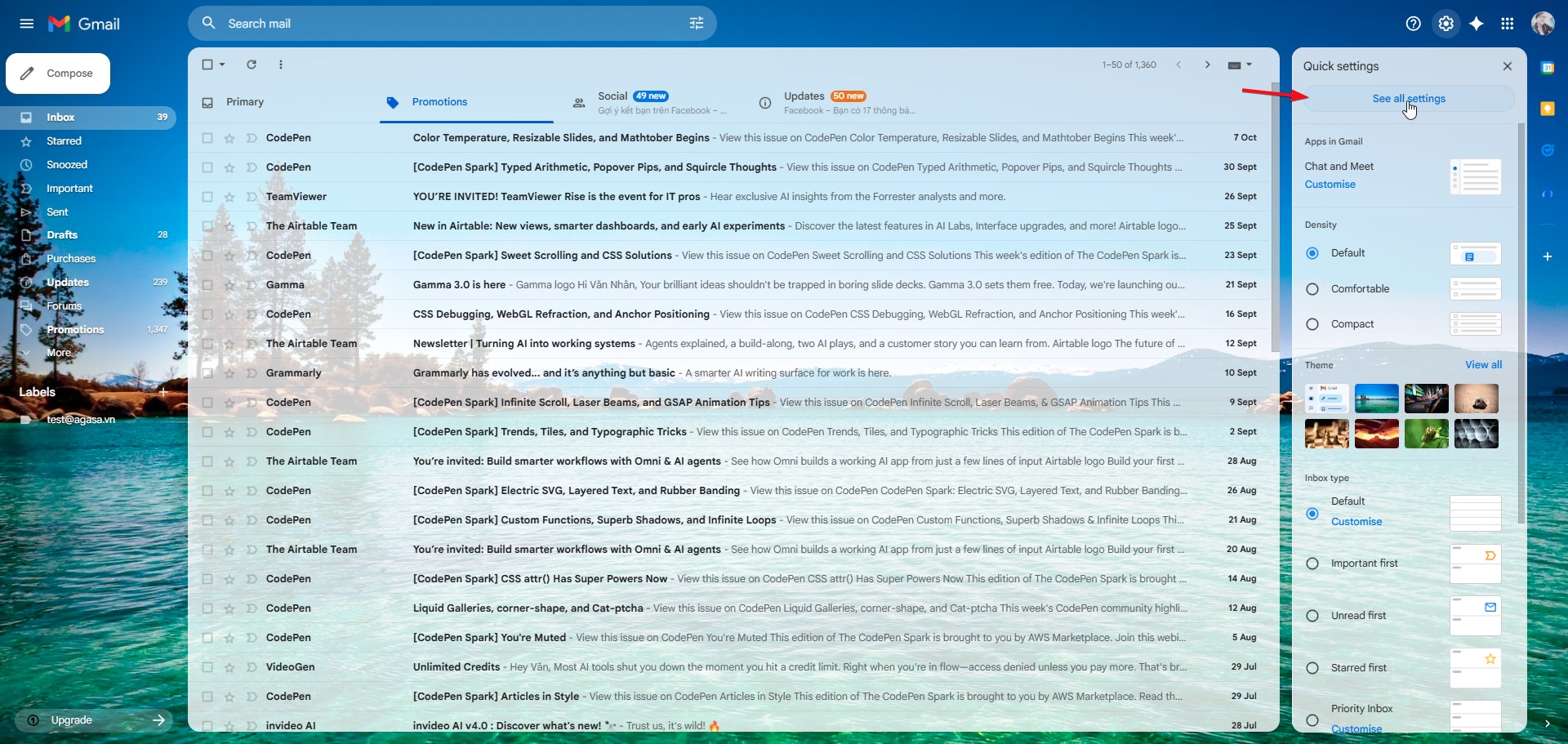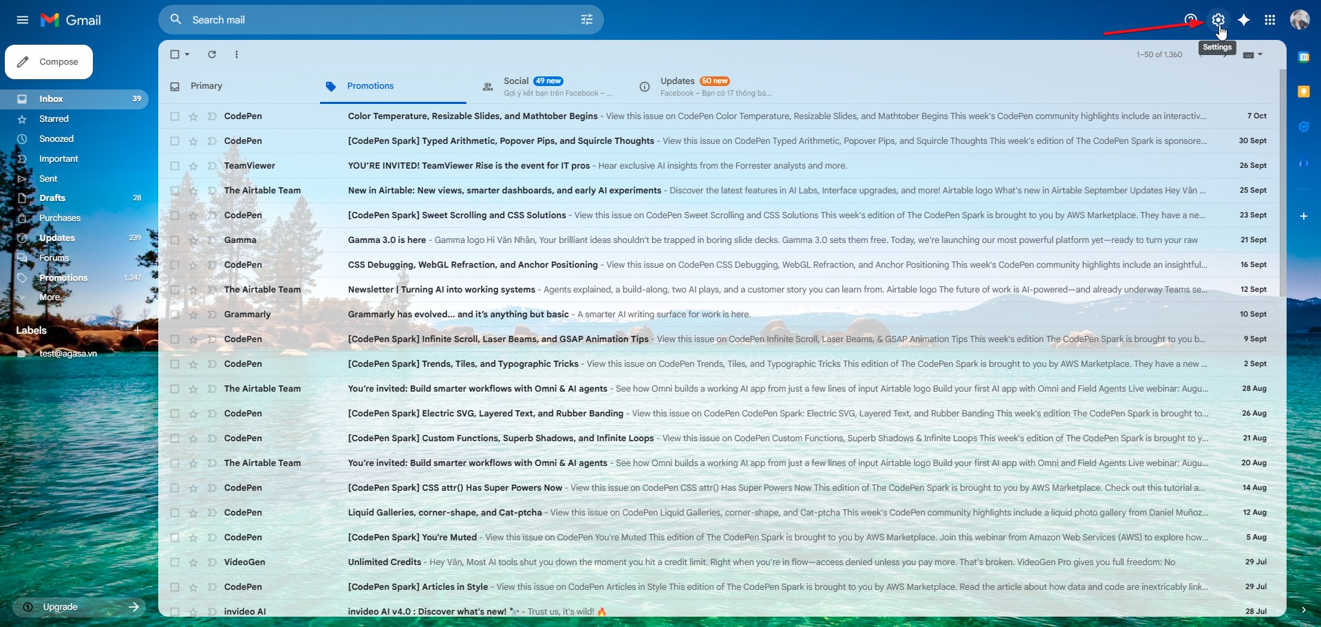 Khi đang ở giao diện của Gmail, bạn hãy click vào mục Settings