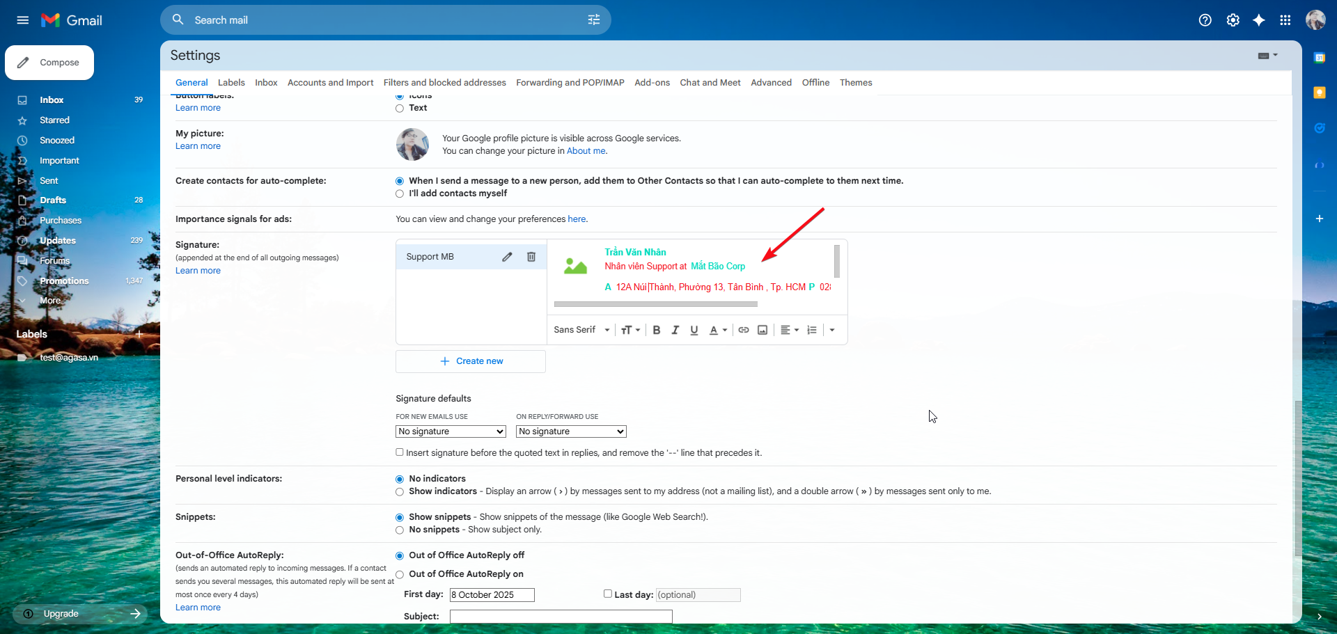 Bây giờ, bạn hãy click chuột vào khung chữ ký và sử dụng tổ hợp phím CTRL + V để paste nội dung chữ ký trước đó đã copy vào nhé.