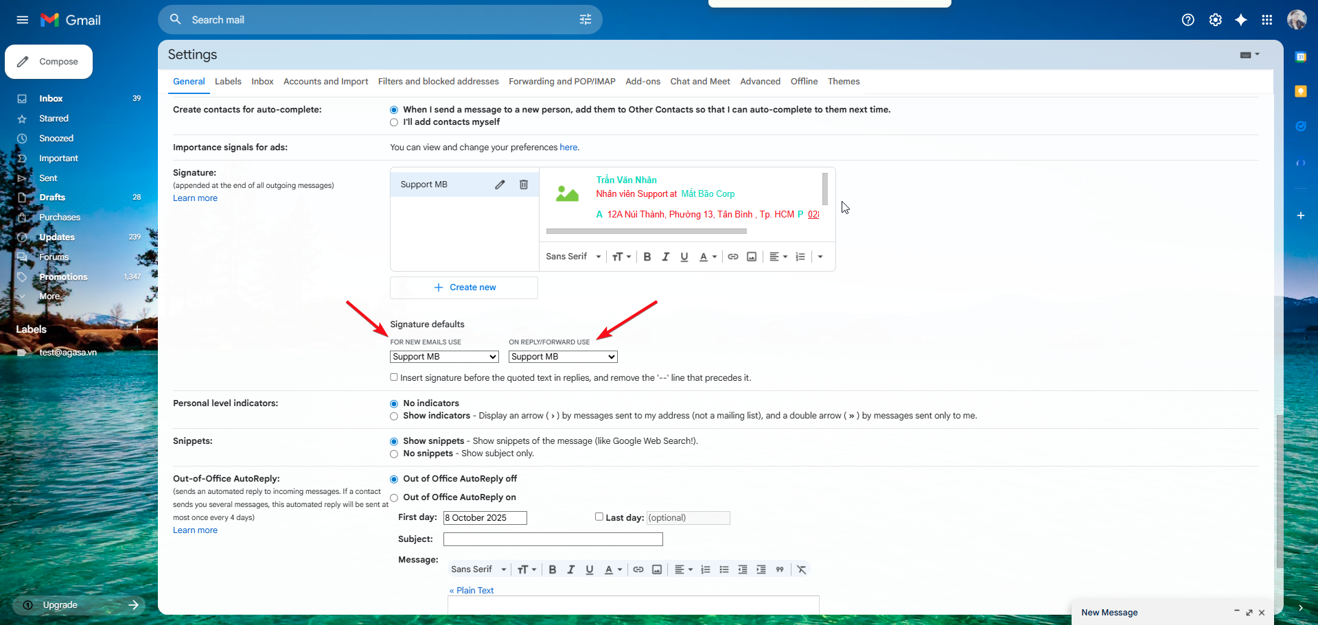 Ở mục Signature Defaults, hãy chọn chữ ký của bạn vừa tạo ở hai mục FOR NEW EMAILS USE và ON REPLY/FORWARD USE