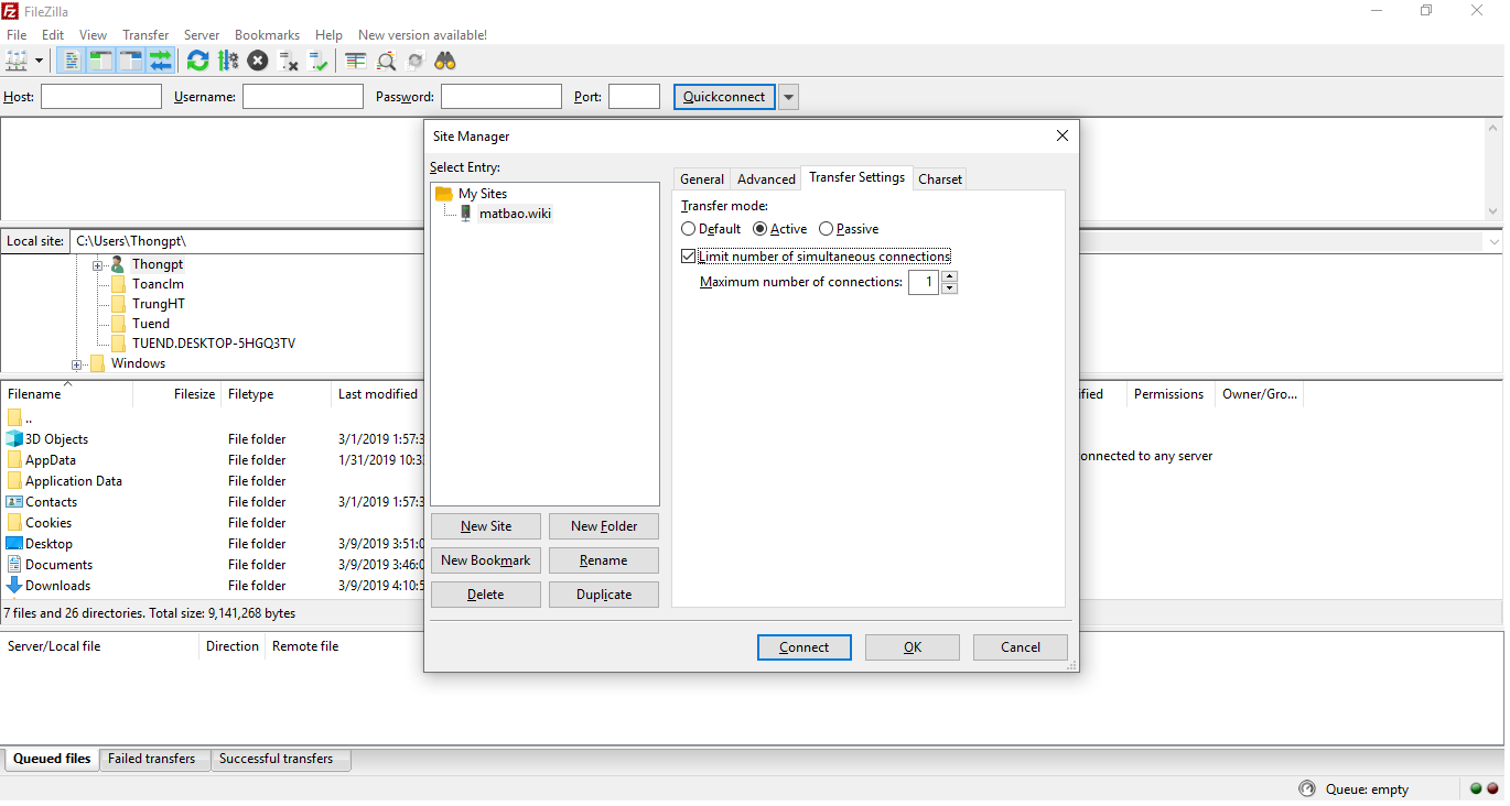 Bài viết này nhằm mục đích hướng dẫn các giới hạn lại số lượng kết nối của FileZilla khi upload dữ liệu lên hosting để không bị chặn kết nối FTP vào hosting tại Mắt Bão.