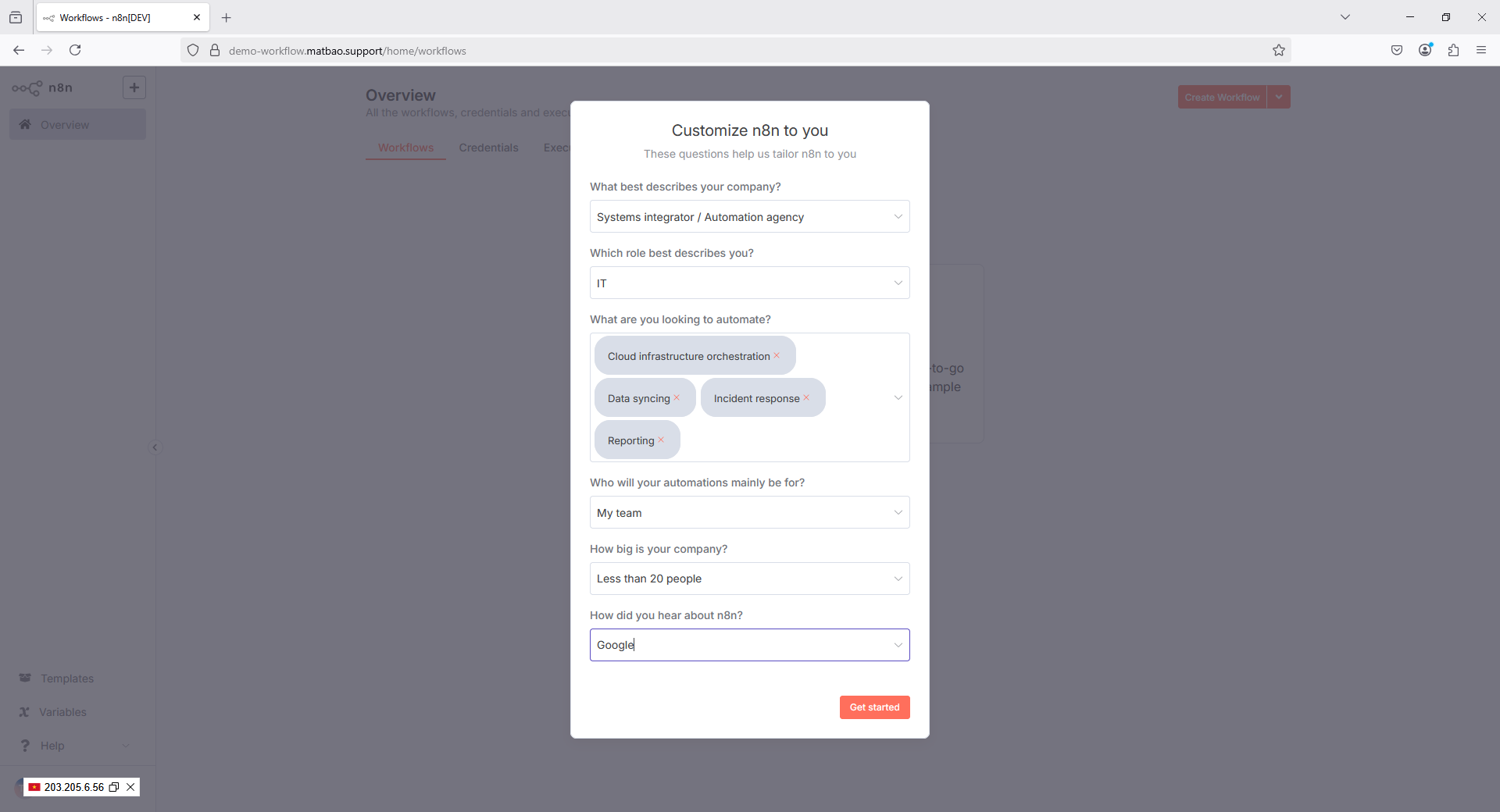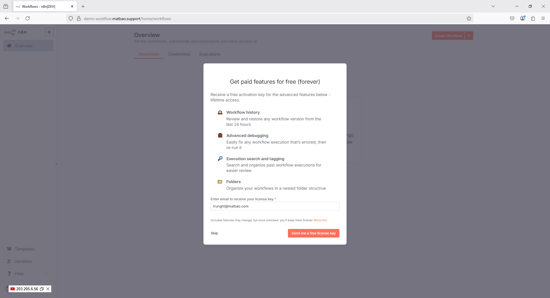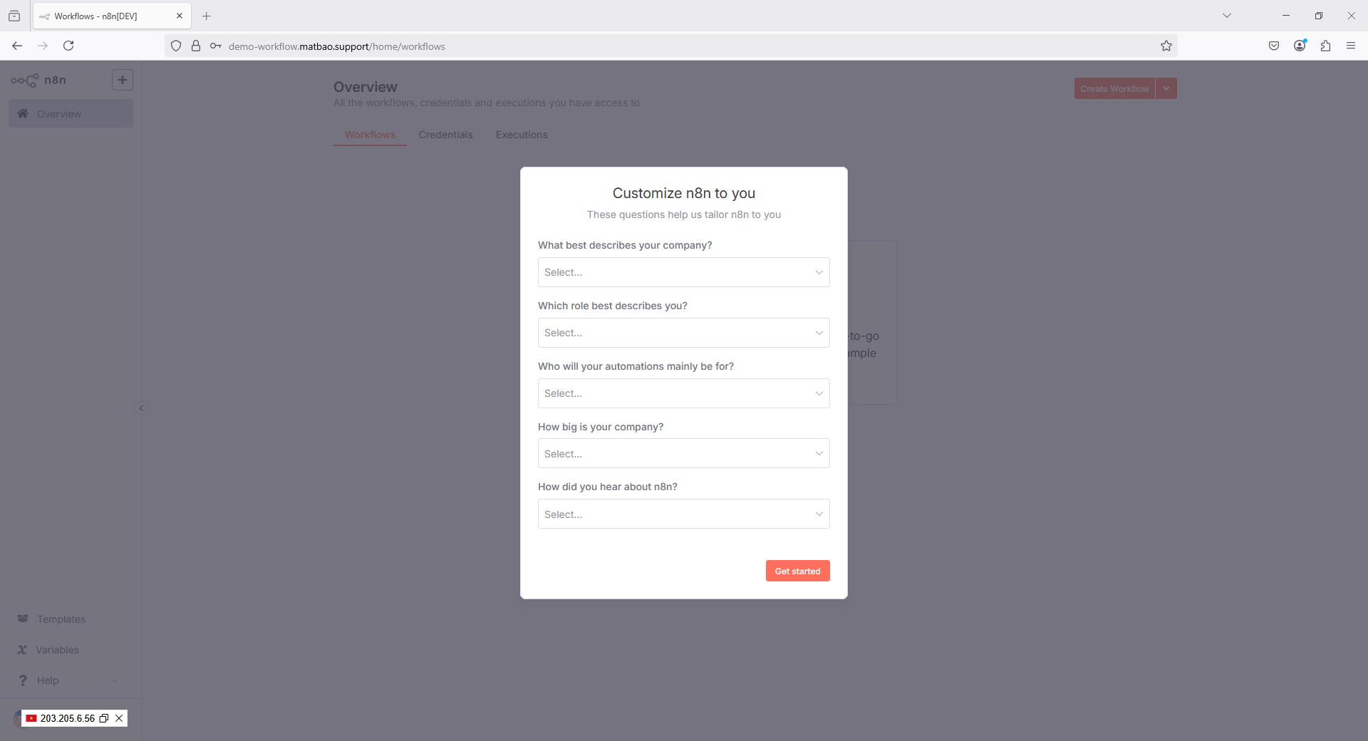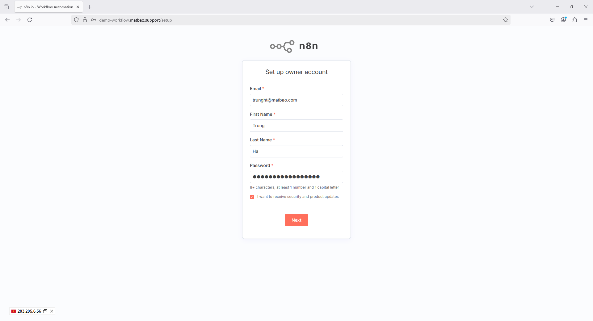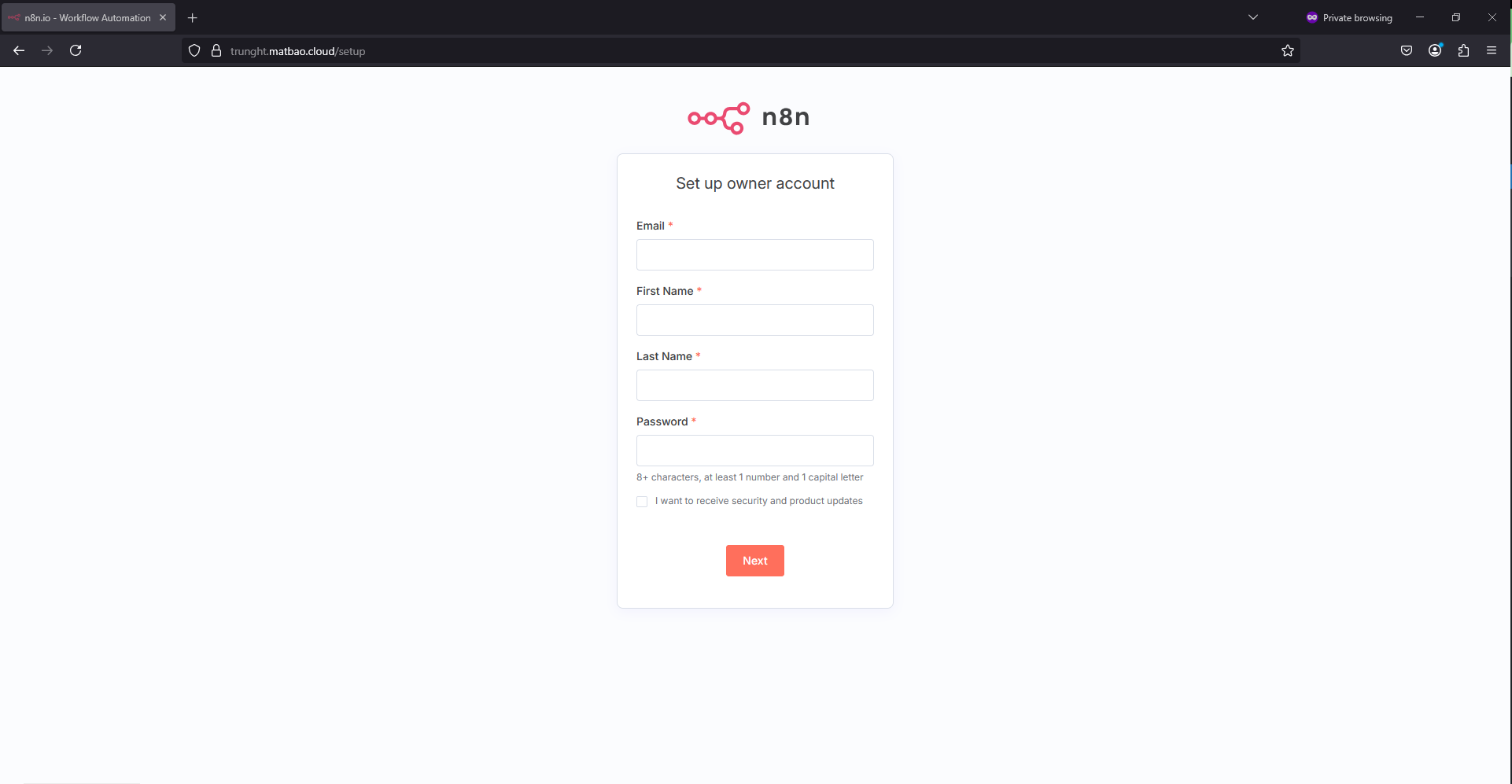 Truy cập địa chỉ http://<your-n8n-domain>/ ( ở bài viết này là trunght.matbao.cloud )