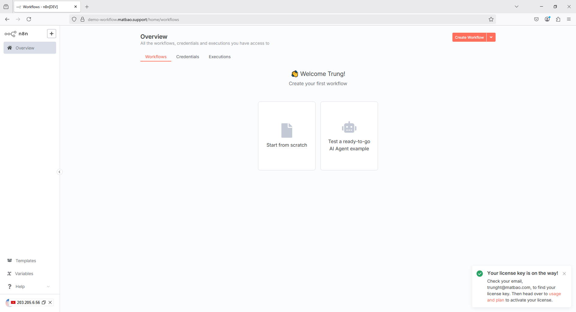 Vậy là bạn đã hoàn tất các bước khởi tạo và kích hoạt N8N, bây giờ bắt đầu sử dụng thôi nào.