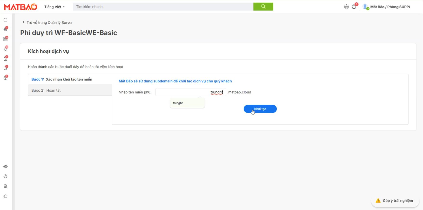 Nhập tên miền phụ ( alias ) để kích hoạt dịch vụ, mặc định, hệ thống sẽ lấy theo tên miền chính matbao.cloud kèm theo tên bạn chọn ( ví dụ: trunght )
