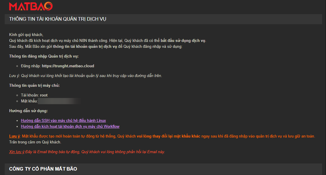Thông tin email trả về sẽ bao gồm đường dẫn truy cập khởi tạo và tài khoản root của máy chủ