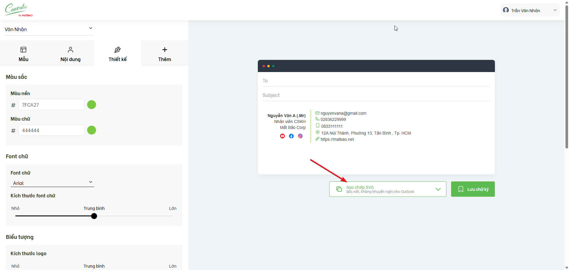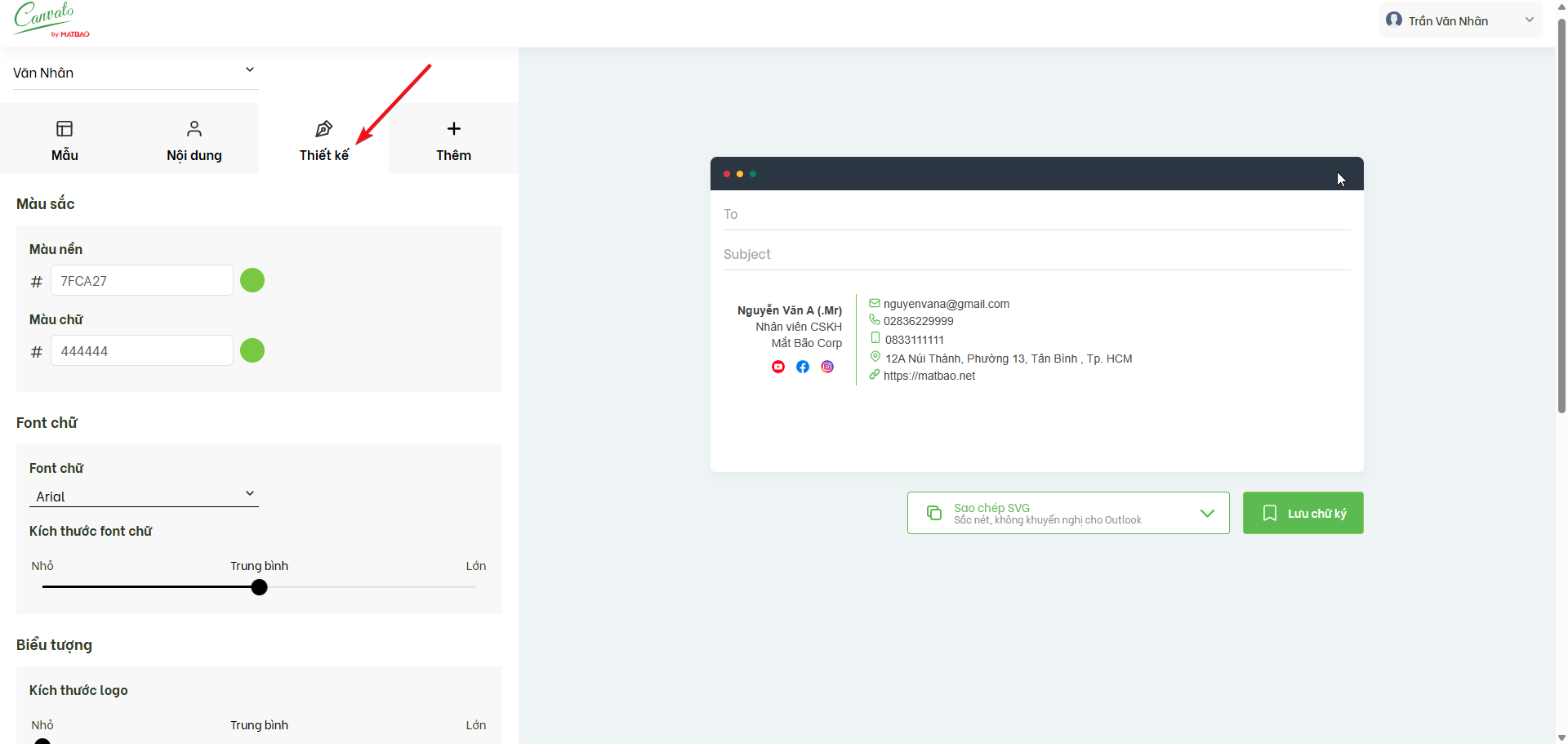 - Bạn có thể điều chỉnh màu chữ ký, font chữ, kích cỡ logo theo sở thích tại mục “Thiết kế“