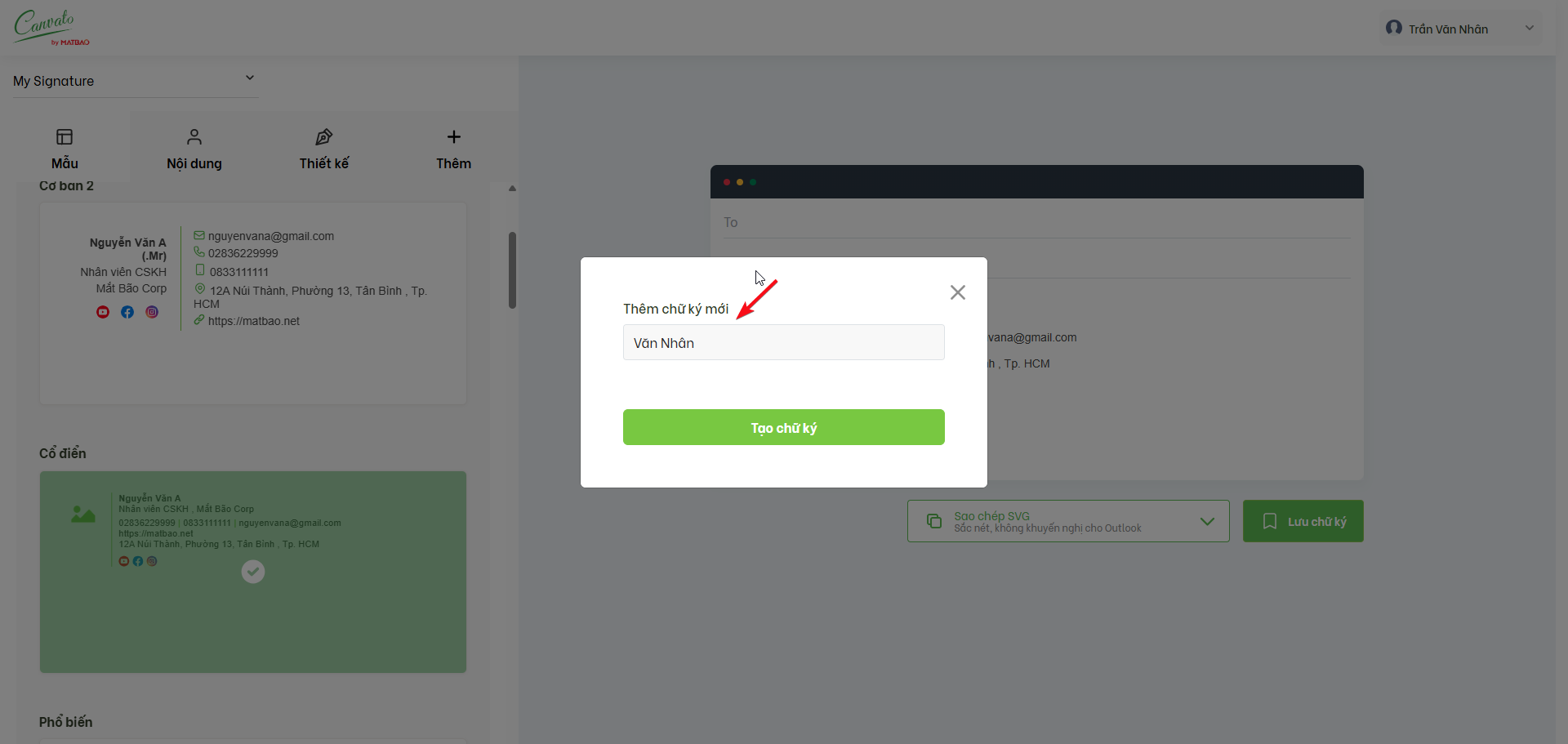- Đặt tên cho chữ ký mới và bấm Tạo chữ ký