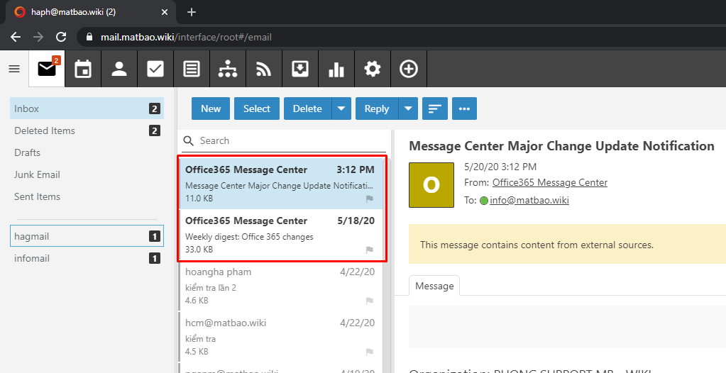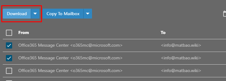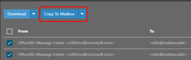 Hoặc bạn có thể copy những lá mail đã được search bên ngoài đến những địa chỉ mail khác nội bộ cùng tên miền, cũng bằng cách tick chọn và bấm nút Copy to Mailbox