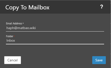 Khi bấm Copy to Mailbox sẽ hiển thị hộp thoại để Bạn điền thông tin địa chỉ mail muốn copy đến và folder bạn muốn đưa mail vào