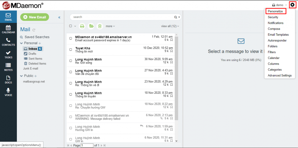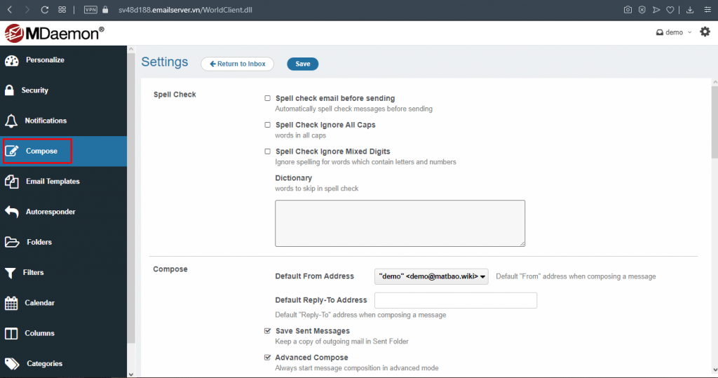 Đầu tiên, bạn phải đăng nhập vào Webmail theo đường dẫn : https://mail.domain.tld (ví dụ : https://mail.matbao.wiki ) và đăng nhập theo thông tin tài khoản mà bạn đã nắm giữ.