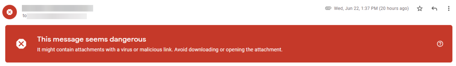 Bộ lọc mail Google sẽ cảnh báo cho người dùng bằng thông báo màu vàng. Với dòng chữ cảnh báo người dùng tránh tải file đính kèm xuống trừ khi bạn biết rõ người gửi và tin tưởng rằng lá mail khả nghi này là hợp pháp.