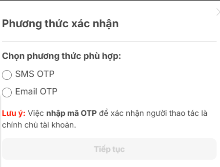 Bước 4: Lựa chọn 1 trong 2 phương thức SMS OTP hoặc Email OTP
