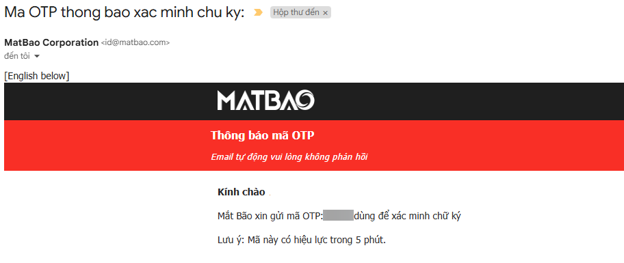 - Phương án Email OTP, bạn sẽ nhận được mail từ địa chỉ id@matbao.com gửi đế với tiêu đề “Ma OTP thong bao xac minh chu ky”